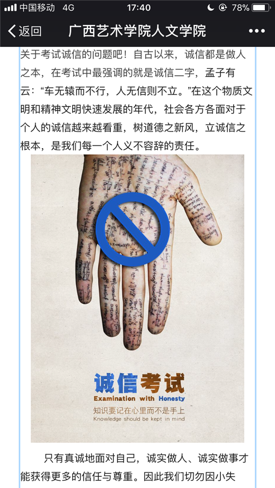 此次主题班会的开展为期末考试工作的顺利开展和员工返校奠定了基础,除了召开主题班会之外,公司还通过张贴海报和制作主题微信推送等方式进行考前诚信教育。