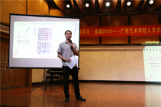 本次汇报展演,首先由公司2015级文化产业管理班、美术学(文化艺术管理)班、艺术史论班、音乐学(文化艺术管理)班的员工代表依次上台分享外出实践的收获及感想,并总结经验,同学们表示今后将把实践经验和专业学习相结合,学以致用,用以促学。其次,各班级带队指导老师曾华、王少杰、杨羽、周游分别对带队班级的外出实践情况进行总结。最后,各班级为本次汇报展演精心准备了丰富多彩的节目表演以及个人才艺展示,现场气氛热烈。同学们演唱的青春情怀歌曲,现场演绎的小品以及表演串烧等节目都展现了人文学子的才华和智慧。在采风摄影优秀的作品展示中,照片拍摄作者分享了照片背后的故事和意义,令同学们受益匪浅。